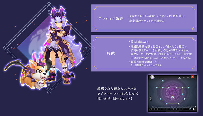 特定の4次職になった冒険者だけが転職でき“英雄職業”の第3弾は、死者の街「ニブルヘイム」を支配する“死の女神「ヘル」”です。アルケミスト系4次職「ミスティック」に転職したことがある冒険者が転職することができる職業です。毒属性攻撃を得意とし、可愛らしくも獰猛で忠実な下僕「ガルム」を使役して戦います。