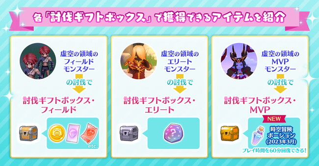 「モーラゴールドチップ」「フェスガチャチケット」、プレイ時間を回復できる「時空冒険ポーション(2023年3月)」などをゲットできます。