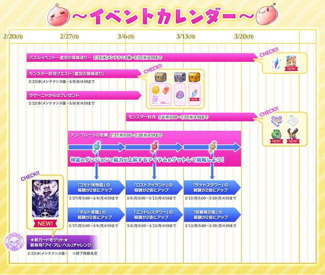 また、「アン・プルーシの依頼」イベントでは高難度ダンジョン「コモド博物島」「ロストアイランド」「タナトスタワー」の各ダンジョン限定で能力が上昇する各種「栄養補給キャンディ」がもらえます。上手に活用して高難度ダンジョンに挑戦してみましょう。