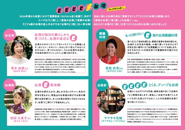 今回、台湾の達人として登場いただくのは、青木由香さん(アートギャラリー「你好我好」店主)、宮武衣充さん(合同会社Mandarine代表)、前田久美子さん(「茶遊サロン」代表)、ヤマサキ兄妹さん(イラストレーター・台南案内人)。美食、美容、美景、美(善)人など、“台湾のビ(美)“をテーマに4組が立てた旅行プランの詳細は、店頭で配布するオリジナルパンフレットでご覧いただけます。達人たちによるトークライブやワークショップと共に、ぜひお楽しみください。その他、台湾の魅力に触れられる本をご紹介するほか、枚方T-SITEでは、台湾で人気を集める食と雑貨のセレクトショップ「神農生活」の商品もご購入いただけます。