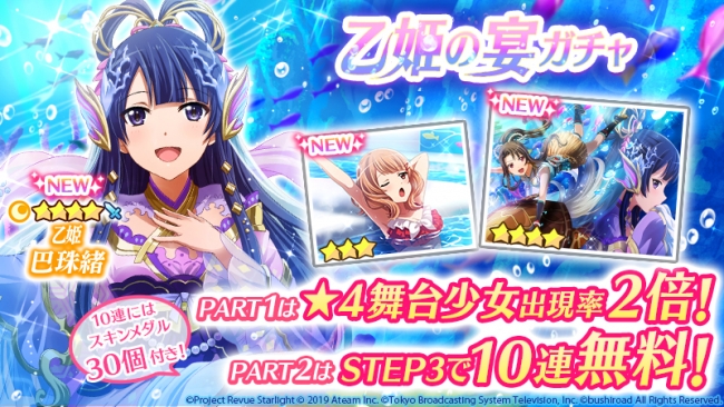 「乙姫の宴ガチャ」は、PART1とPART2の2種類。PART1では★4舞台少女の出現率が2倍になっています。PART2では、1回目と2回目の10連ガチャで新登場の舞台少女またはメモワールが1点確定で手に入り、3回目の10連ガチャは無料で引くことができます。