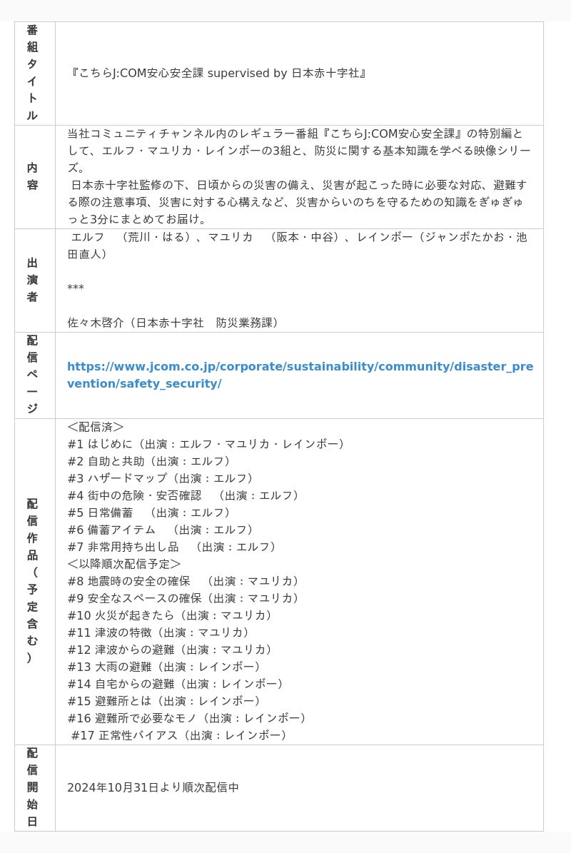 JCOM株式会社(J:COM、本社:東京都千代田区、代表取締役社長:岩木 陽一)は、2024年10月より、吉本芸人の「エルフ」、「マユリカ」、「レインボー」とともに防災知識を学ぶ映像シリーズ『こちらJ:COM安心安全課 supervised by 日本赤十字社』を特設サイト及びJ:COM 公式YouTubeで無料配信しています。2024年10月31日(木)からは、エルフ出演回を全話公開します。