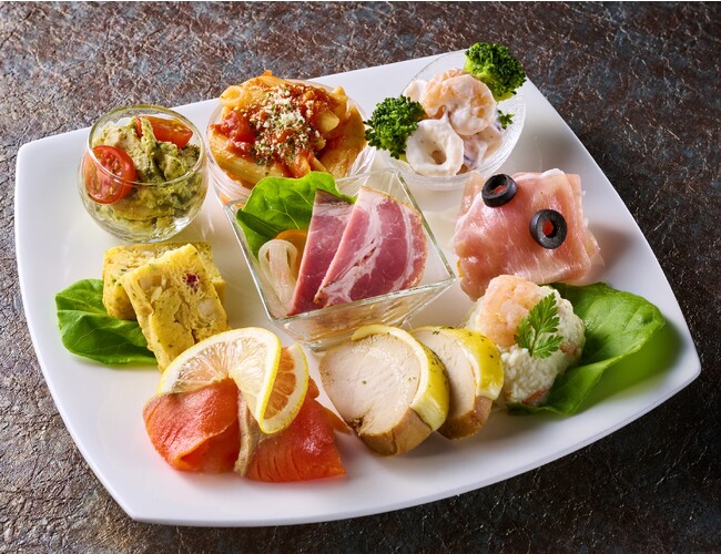 ローストポークやスモークサーモン酢漬、スペイン風オムレツなど、9種の多彩なオードブル詰め合わせ。