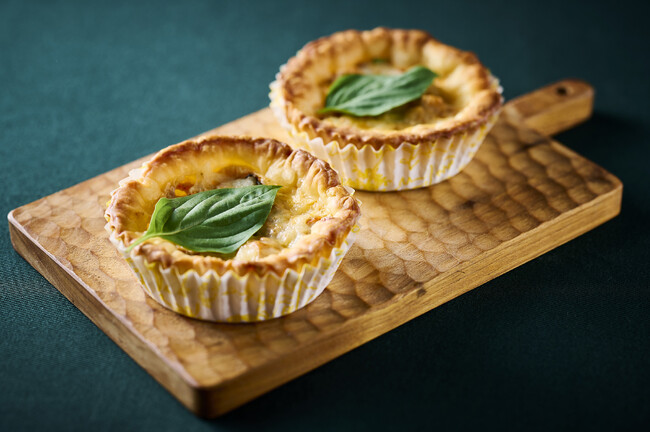 クロワッサン生地のキッシュにラタトゥイユとグリルチキンをトッピング。バジルがアクセントです。
