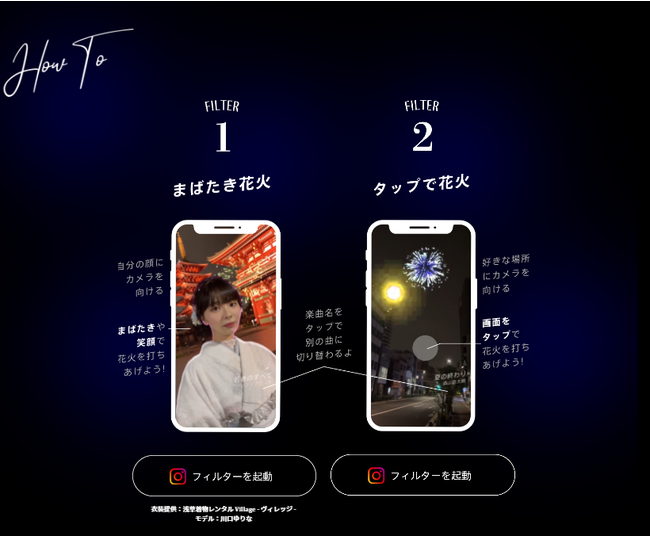 花火・夏に関連する楽曲を使用したインスタグラムのミュージックフィルターを、特設サイト「#うたとはなび」にて配布しています。