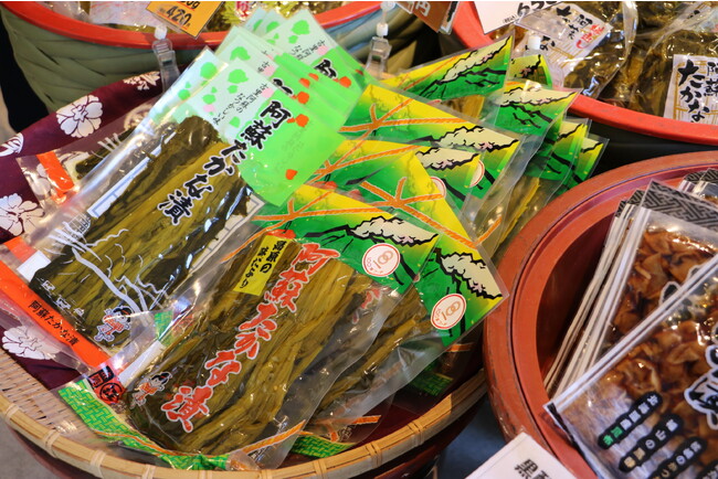 まずは参道にあるつけもの処「健蔵」で、阿蘇特産の高菜漬けや高菜まんを頂きます。