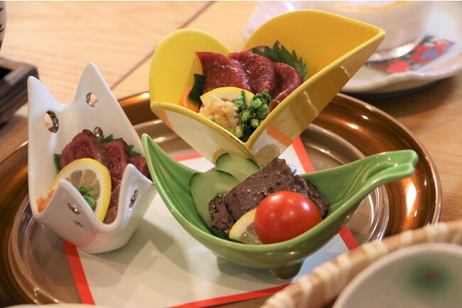 夕食を頂くのは、今宵のお宿「阿蘇プラザホテル」。阿蘇五岳を望むお部屋で馬肉、牛肉を贅沢に味わうディナーコースを堪能します!まずは3種類の馬肉料理、馬刺し・たたき・焼きのそれぞれ異なる味わいを楽しみます。