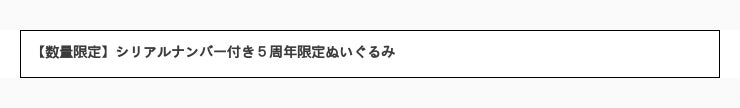 5周年のロゴを足の裏に施し、シリアルナンバーカード付の箱に入った特別なぬいぐるみ。