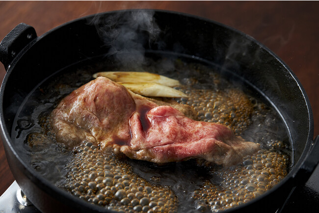 ご注文をいただいてから焼きすき用の鉄板をご用意して、お客様の目の前で焼き上げます。熱々の鉄板の上に〈粉黒糖〉と〈湯浅醤油〉の香ばしい香りが広がり、更に、焼きたてのお肉の香りが混ざった香りは食欲を掻き立てられます。宮城県から取り寄せた〈竹鶏たまご〉の黄身に絡めてお召し上がりください。