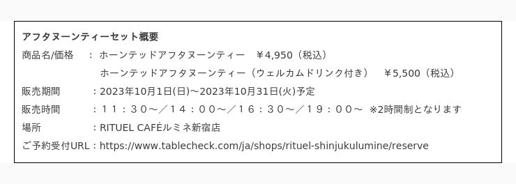 株式会社ベイクルーズ(本社:東京都渋谷区、取締役CEO:杉村 茂)が運営するフレンチスタイルのカフェ「RITUEL CAFE(リチュエル カフェ)」は、"ハロウィン”をテーマにした1ヶ月限定のアフタヌーンティーセットをRITUEL CAFE ルミネ新宿店にて2023年10月1日(日)から提供いたします。