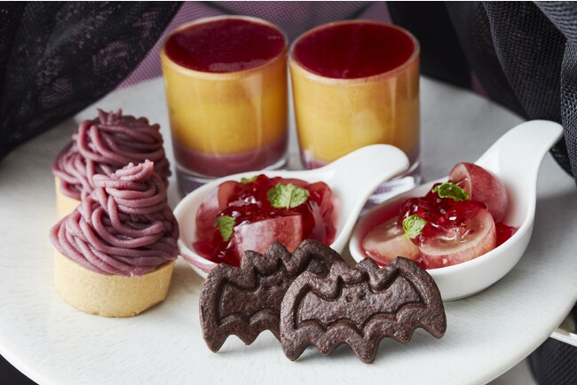 上段にはコウモリの形が目を引くクッキーや、秋の味覚の紫芋を使用したモンブラン、かぼちゃとカシスを2層ムースにしたグラススイーツのほか、葡萄の味わいが口に入れた瞬間に広がる、葡萄とミントのクランベリーゼリーをお楽しみください。