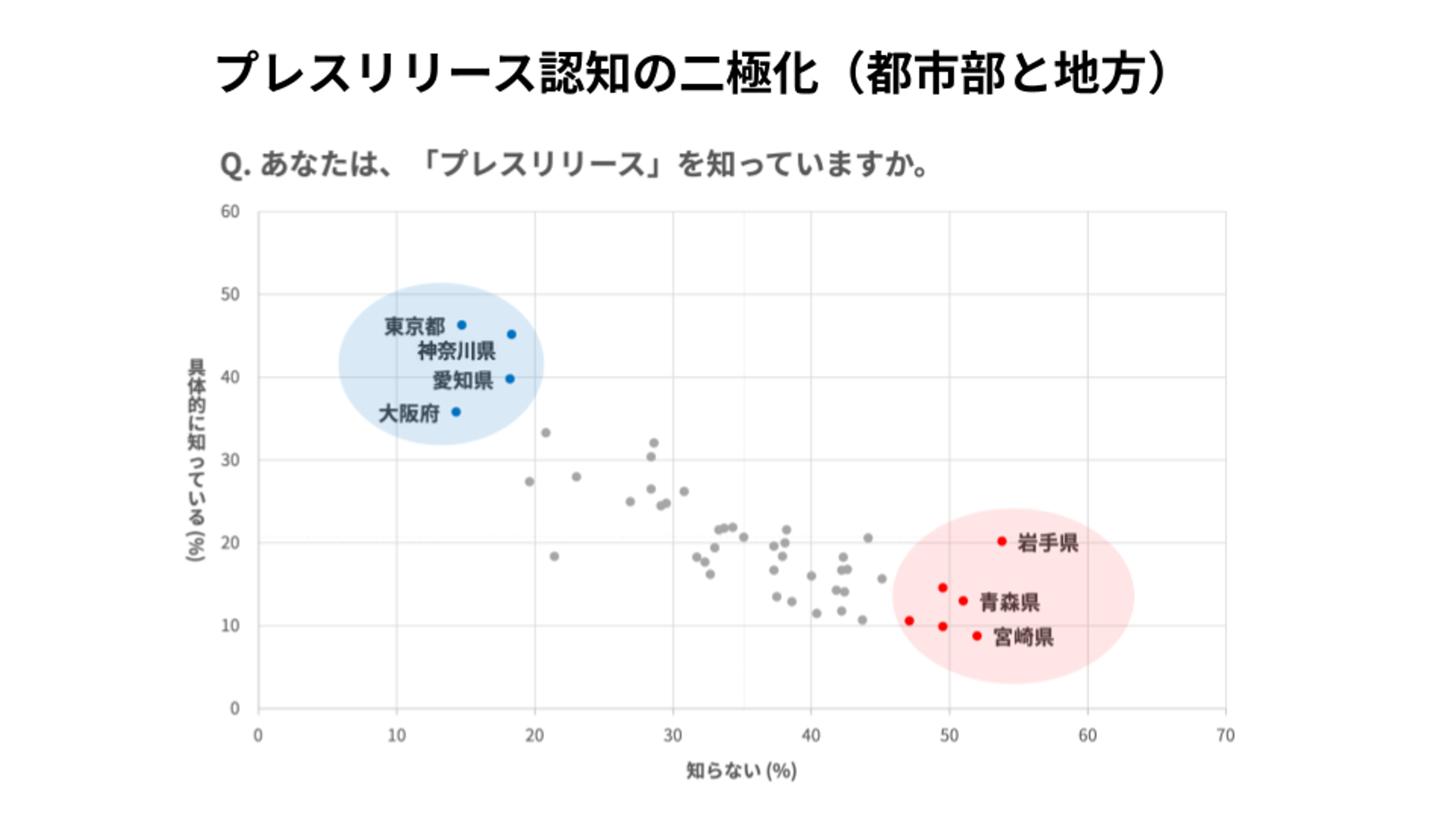 しかし、当社が日本全国のビジネスパーソン4839名を対象に実施した調査(2025年9月29日〜2025年10月8日集計)では、「プレスリリース」自体の認知度を図る設問において、「具体的に知っている」と回答した上位5都市は東京都、神奈川県、愛知県、大阪府、兵庫県と都市部に集中し、「知らない」と回答した上位5都市は岩手県、宮崎県、和歌山県、沖縄県、香川県という結果となり、プレスリリースの認知度に地域差があることがわかりました。