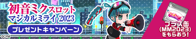 「初音ミクスロット マジカルミライ 2023」を30回、60回、120回まわすと「プラス缶(MM2023)(★5)」を1個ずつ、最大3個プレゼントします。「プラス缶(MM2023)(★5)」を手に入れたら、コラボメンバーの「+値」を上げてパワーアップさせましょう。