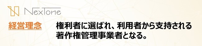 NexToneグループは「権利者に選ばれ、利用者から支持される著作権管理事業者となる。」ことを経営理念に掲げ、「次代を奏でる著作権エージェント」として著作権管理業務の他、デジタルコンテンツディストリビューション業務やキャスティング事業といった利用促進事業を通じ音楽コンテンツの経済価値最大化を図り、豊かな社会の実現、音楽文化・音楽産業の発展に貢献することを目標としております。