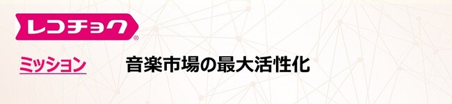 レコチョクは「音楽市場の最大活性化」をミッションに掲げ、「音楽業界のIT部門」を目指し、個人・法人向けの音楽配信事業をはじめ、権利者へのビジネス支援を目的としたソリューション事業の他、web3などブロックチェーン技術を活用したサービスの企画・開発、さらに子会社の株式会社エッグスではインディーズアーティストの活動支援を展開しています。