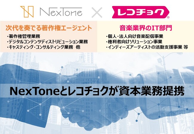 株式会社NexTone(本社:東京都渋谷区、代表取締役CEO:阿南雅浩、以下「NexTone」)と、株式会社レコチョク(本社:東京都渋谷区、代表取締役社長:板橋徹、以下「レコチョク」)は、両社の企業価値向上と新たな音楽ビジネスの創出を目的として戦略的な資本業務提携を行うことをお知らせいたします。