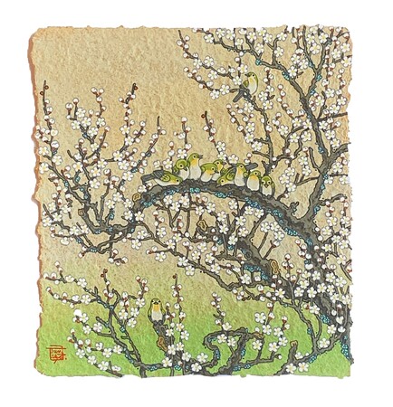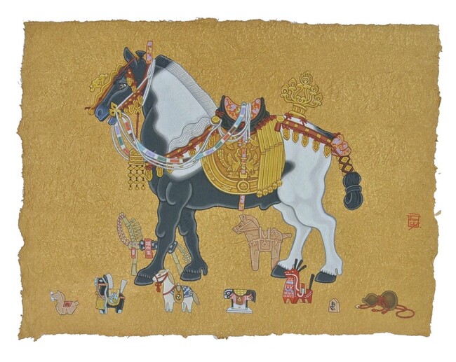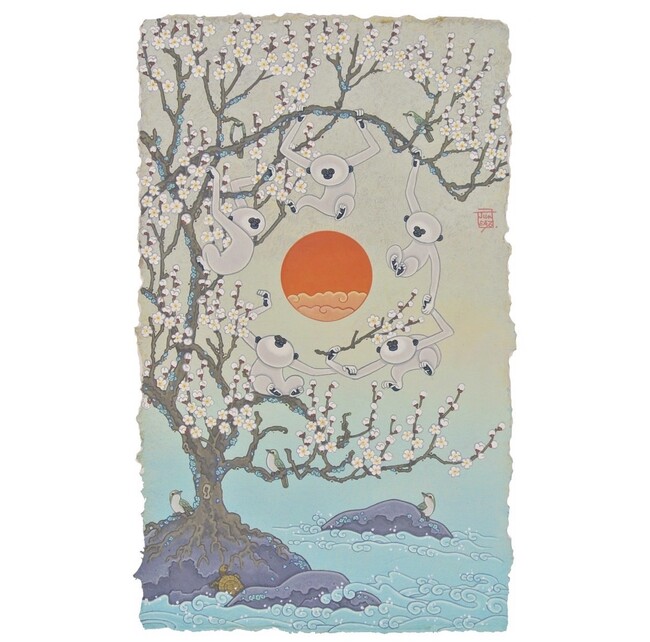 色鮮やかな花鳥百獣の世界。吉祥や風習、縁起物を取り入れた独創的な動物画の数々。紙にもこだわり、竹100%の手漉き和紙「竹紙」を使用しています。