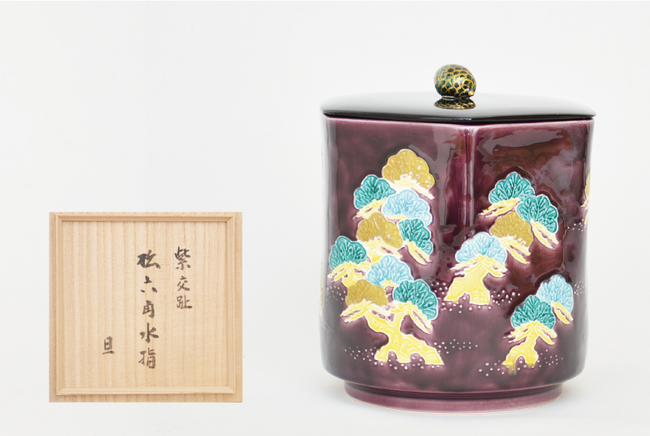 紫交趾松六角水指 而妙斉宗旦宗匠在判・御箱書