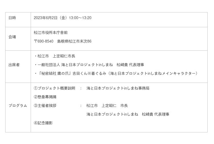一般社団法人海と日本プロジェクトinしまねは、松江市と連携し2023年度、海洋ごみの削減をめざした様々な事業展開を始動します。今回はそのキックオフイベントとして2023年6月2日13時にオリジナル懸垂幕の掲揚式を実施し松江市上定昭仁市長とともに”海ごみゼロ”を宣言します。このイベントは、日本財団が推進する海洋ごみ対策プロジェクト「海と日本プロジェクト・CHANGE FOR THE BLUE」の一環で開催するものです。
