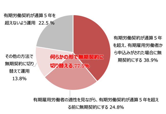 何らかの形で無期契約に切り替えるという対応が77.5%を占めるものの、クーリング期間を設けるなど有期労働契約が通算5年を超えないように運用する企業も22.5%あることがわかった。【図5】