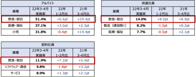 採用活動実施率も[飲食・宿泊]が最も高く、アルバイトが51.4%(21年3-4月比:29.4pt増)、派遣社員が14.0%(21年3-4月比:8.9pt増)、契約社員が11.9%(21年3-4月比:5.4pt増)となった。【図3】
