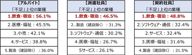 【図1】雇用形態別「不足」上位の業種 ※上位一部抜粋