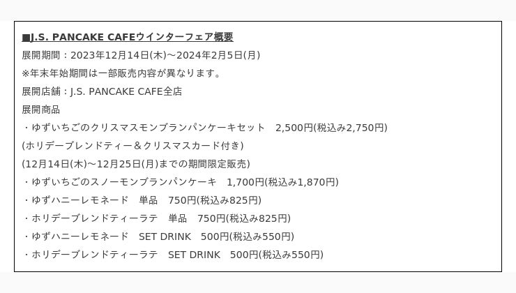 株式会社ベイクルーズ(本社: 東京都渋谷区、取締役CEO: 杉村 茂)が運営するパンケーキショップ「J.S. PANCAKE CAFE」は2023年12月14日(木)より、ゆずホワイトクリームに包まれた真っ白なモンブランパンケーキとシーズナルドリンク、ミニパンケーキサンデーを期間限定販売いたします。