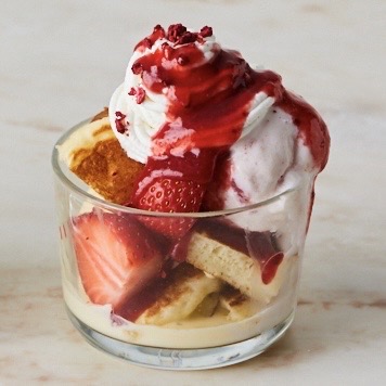 カットしたミニパンケーキと、ストロベリーマスカルポーネ&バニラの2種のアイスに、ゆずホワイトクリームと苺をトッピングしたミニデザート。