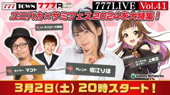 株式会社サミーネットワークスは、ぱちんこ・パチスロがパソコン、スマホで打てる「777TOWN(スリーセブンタウン)」、無料で遊んで豪華景品がもらえるスマホ向けサービス「777Real(スリーセブンリアル)」の生放送を、2024年3月2日(土)20時から配信いたします。