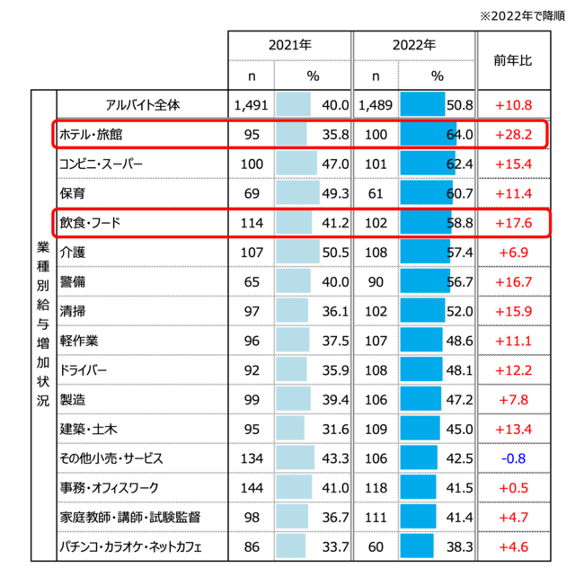 直近半年間でアルバイトの給与を「上げた」企業の割合は50.8%と半数を超え、前年より10.8pt増加。業種別では、飲食・宿泊業で前年より大幅に上昇。