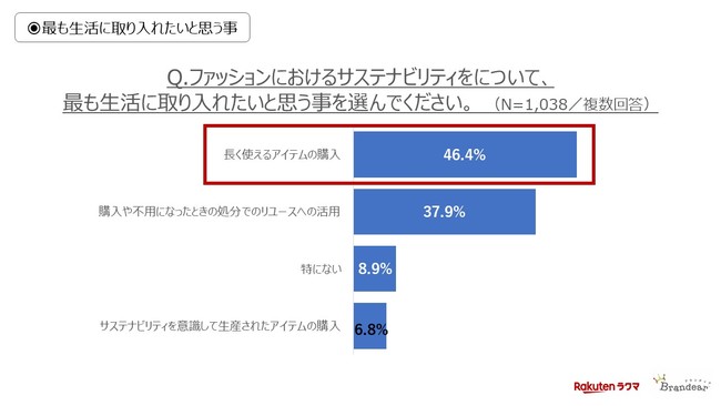 「ファッションにおけるサステナビリティについて自分の生活に取り入れたいこと」について質問をしたところ、「長く使えるアイテムの購入」(46.4%)が最多となり、次いで「購入や不用になったときの処分でリユースの活用」(37.9%)、「特にない」(8.9%)という結果になりました。