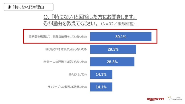 前問での質問で「特にない」(8.9%)と回答した92名を対象に、「その理由」を質問したところ、「節約等を意識して、無駄な消費をしていないため」(39.1%)が最多となり、次いで「取り組むべき背景がわからないため」(29.3%)、「自分一人の行動では変わらないため」(28.3%)という結果となりました。