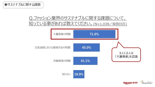 「ファッション業界のサステナビリティに関する課題」について質問したところ、「大量廃棄の問題」(71.6%)が最多となり、次いで「生産過程における環境汚染の問題」(45.0%)、「労働環境の問題」(41.1%)という結果となりました。