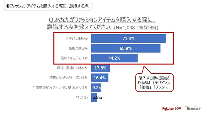 「ファッションアイテムを購入する際に意識している点」について質問したところ、「デザインが良いか」(71.4%)が最多となり、次いで「価格が適正か」(65.9%)、「信頼できるブランドか」(44.2%)という結果となりました。サステナブルな視点では「環境に配慮した材料か」(17.8%)が4番目に、「生産過程がフェアトレードに基づいていいるか」(9.2%)が6番目となりました。