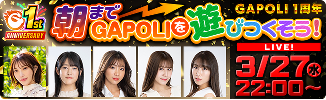 3月27日(水)22時より、GAPOLI公式YouTubeチャンネルにてオールナイト生放送「GAPOLI1周年!朝までGAPOLIを遊びつくそう!」を配信いたします。生配信中は出演者によるGAPOLIのゲーム対決や、視聴者も参加できる企画も開催!また、生放送を記念して出演者の生チェキがGETできるチャンス!GAPOLIを遊んで生チェキチケットを集めて応募しよう!