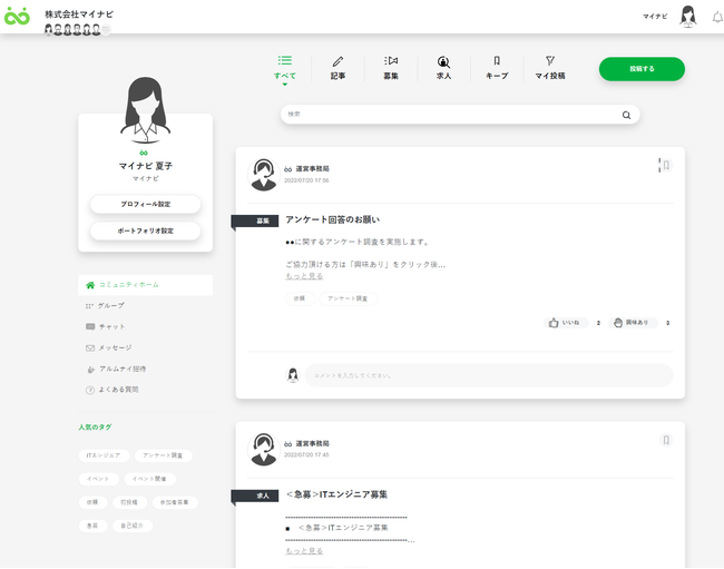 アルムナイや社員などの個人ユーザが気軽に交流できるクローズドSNS機能を搭載しています。