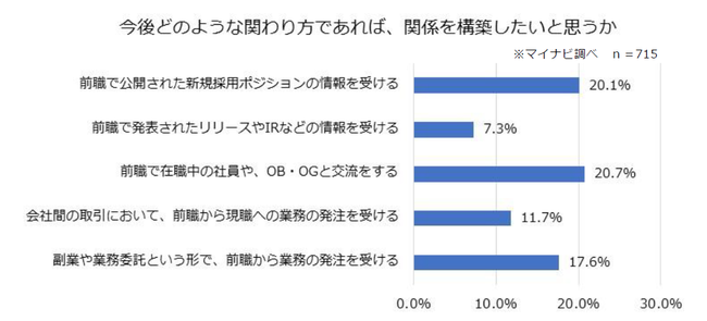 しかし、「関わりは一切ない」と回答した人も「新規採用ポジションの情報を受ける」「OB・OGと交流する」「前職から業務の発注を受ける」といった関わり方次第で、今後の関係構築を前向きに考えていることが分かりました。