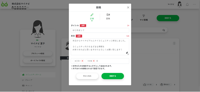 「記事」と「募集」の2種類から選択して投稿ができます。「記事」は近況の報告やさまざまな情報共有の手段として、「募集」は協働相手を探したりイベントの参加を促したりする際に活用します。