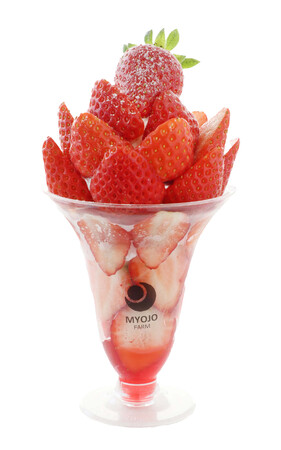 いちごゼリー、厳選いちご、いちごムース、いちごソルベ、いちごピューレを使用した、いちご農園が作る最初から最後までいちご尽くしの絶品パフェをイートインでどうぞ。