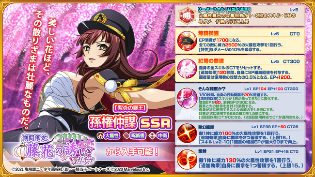 本日開始の「藤花の誘いガチャVol.1」では、新たに「【紫炎の暴王】孫権仲謀」(CV:大橋 彩香)が登場。