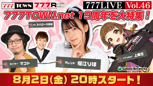株式会社サミーネットワークスは、ぱちんこ・パチスロがパソコン、スマホで打てる「777TOWN(スリーセブンタウン)」、無料で遊んで豪華景品がもらえるスマホ向けサービス「777Real(スリーセブンリアル)」の生放送を、2024年8月2日(金)20時から配信いたします。