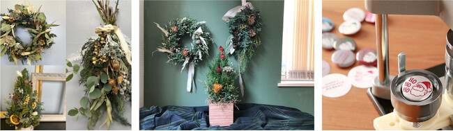 地元のアーティストが講師になり、クリスマスリースやクリスマススワッグ作りの予約制のワークショップを行います。本物のヒロムスギやユーカリで作るリースやスワッグはクリスマスまでの毎日を彩ります。さらに、当日でも楽しめる「オリジナルクリスマス缶バッチづくり」のワークショップも開催します。