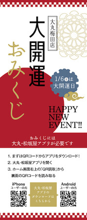 おみくじに書いてあるQRコードを読み取ると、抽選で、大丸梅田店で使える!アプリクーポン10万円分が当たるチャンスです!*税込5,500円以上のお買上レシート1枚につき1枚お渡しします。*一部対象外店舗あり。