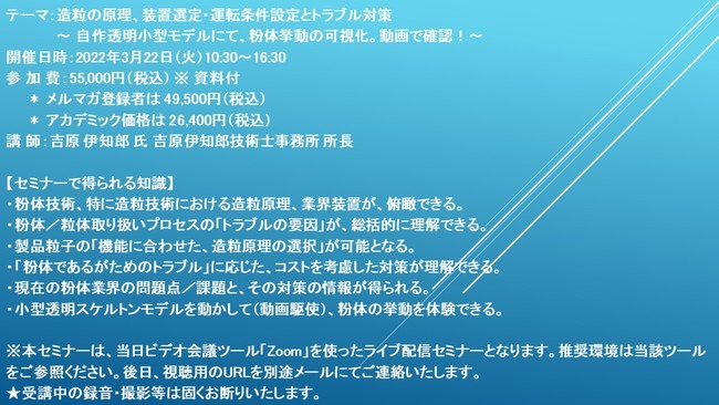 先端技術情報や市場情報を提供している(株)シーエムシー・リサーチ(千代田区神田錦町: https://cmcre.com/ )では、 各種材料・化学品などの市場動向・技術動向のセミナーや書籍発行を行っておりますが、 このたび「造粒の原理、装置選定・運転条件設定とトラブル対策〜 自作透明小型モデルにて、粉体挙動の可視化。動画で確認!〜」と題するセミナーを、 講師に吉原 伊知郎 氏 吉原伊知郎技術士事務所 所長)をお迎えし、2022年3月22日(火)10:30より、 ZOOMを利用したライブ配信で開催いたします。 受講料は、 一般:55,000円(税込)、 弊社メルマガ会員:49,500円(税込)、 アカデミック価格は26,400円(税込)となっております(資料付)。