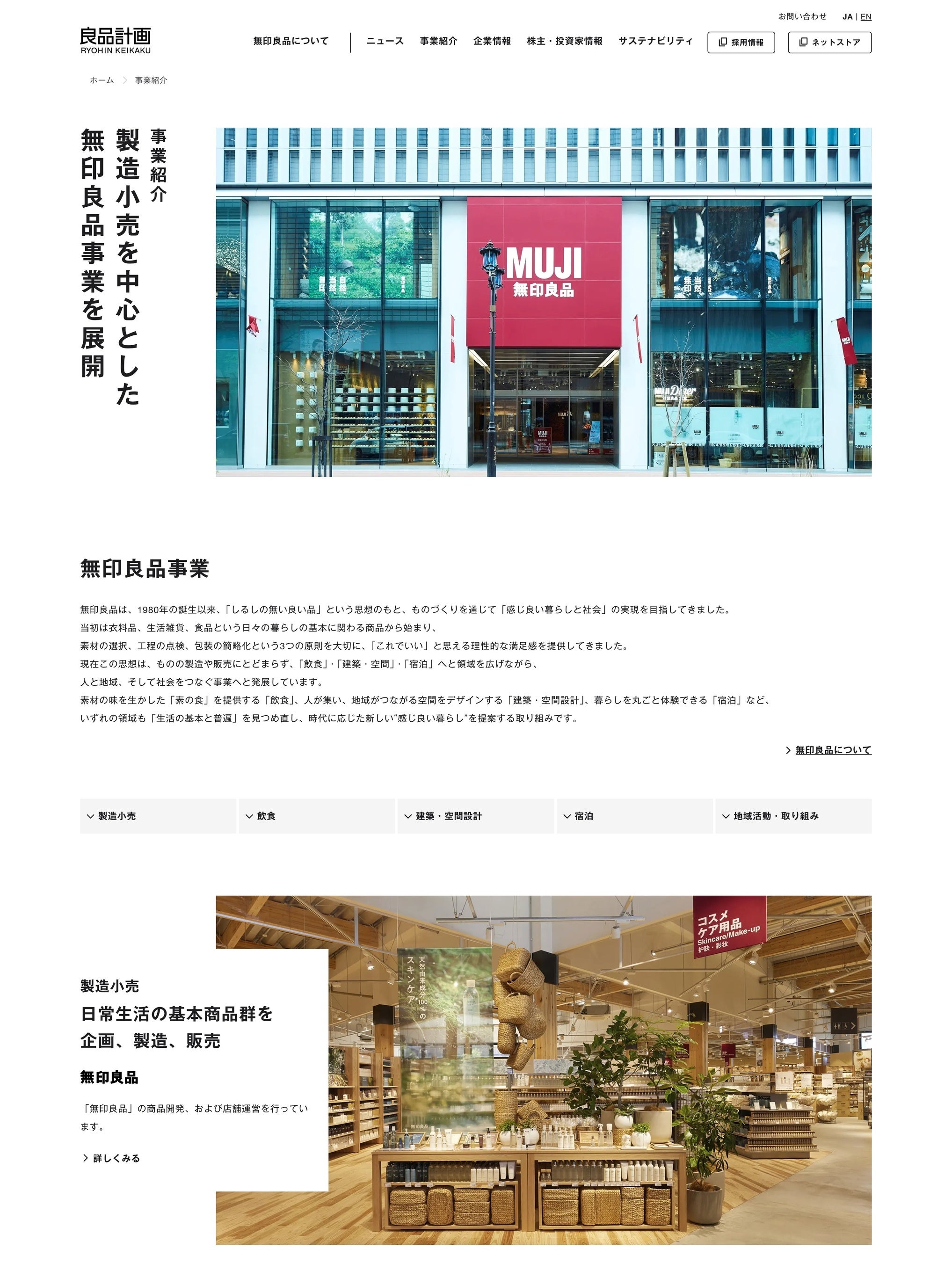 2021年に掲げた「第二創業」以降、良品計画の事業や活動が多様化していることを踏まえ、新たに「事業紹介」ページを設け、領域別に紹介しています。