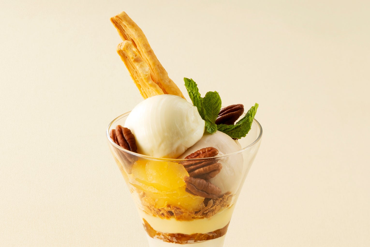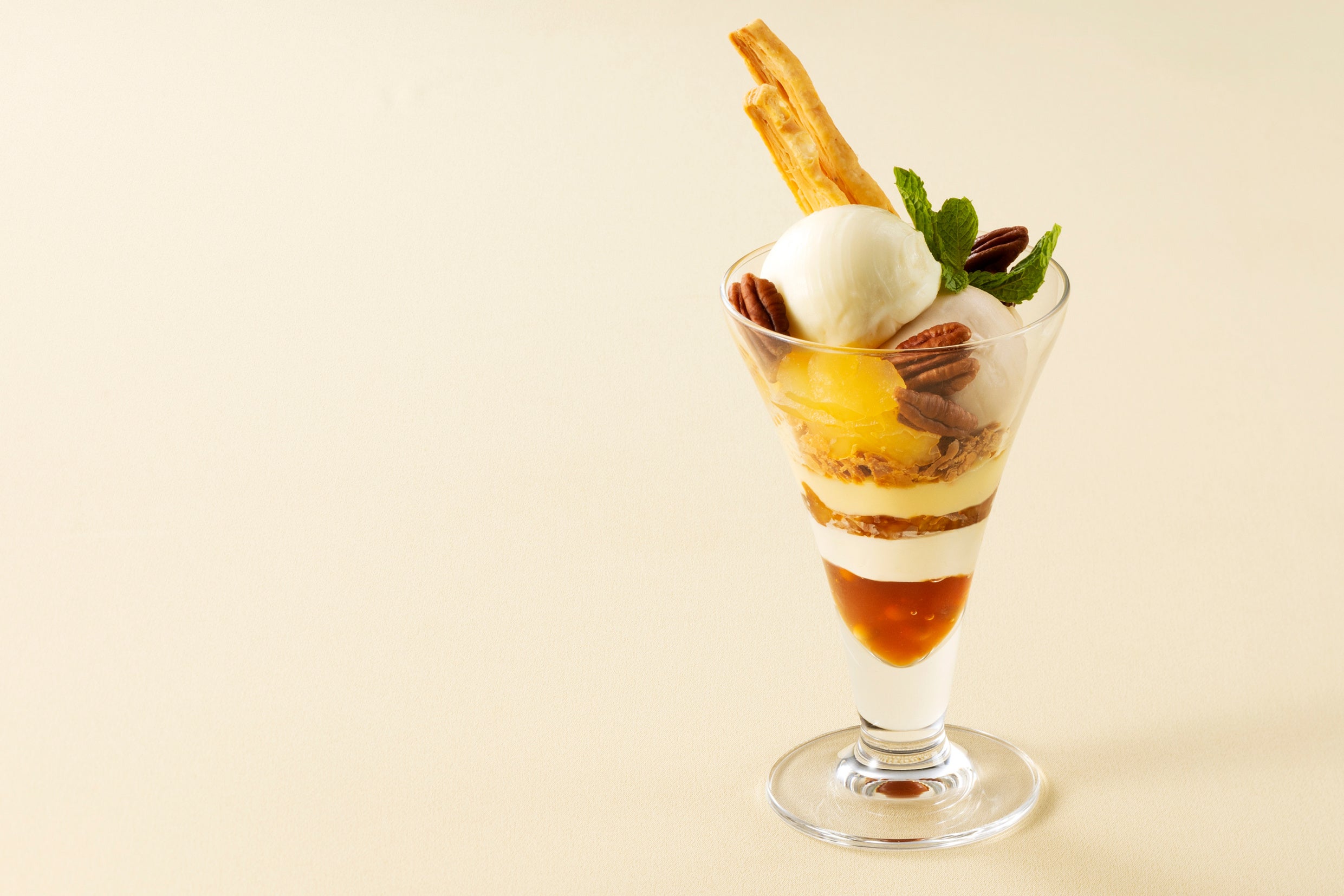 グラスの底にグランドアールグレイのジュレを敷き、その上にグランドアールグレイのジェラート、りんごやピーカンナッツ、りんごのソルベを重ねました。口に運ぶたびに感じる味の変化をお愉しみください。