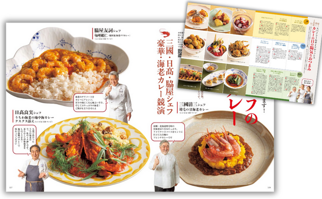 暑い夏のご馳走といえば「カレー」ですが、そのスタイルは作り手によって十人十色。今回は日本を代表する3名のグランシェフである三國清三シェフ、日高良実シェフ、脇屋友詞シェフに、秘伝の技と隠し味をピリッときかせたオリジナルのカレーレシピを教えていただきました。”海老”が主役のご馳走カレーの競演。そして、盛夏のおもてなしカレーやまかないカレーの特別公開、カレーの日のスパイシーなおつまみと盛りだくさん。「2人には負けられないぞ!」とそれぞれのシェフが心を込めて生み出した、バラエティ豊かなレシピは永久保存版です。