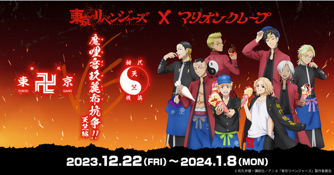 TVアニメ『東京リベンジャーズ』と『マリオンクレープ』のコラボレーション企画「魔哩音玖麗布(マリオンクレープ)抗争 天竺編」が、2023年12月22日(金)〜2024年1月8日(月・祝)にかけて12エリア28店舗のマリオンクレープで開催。