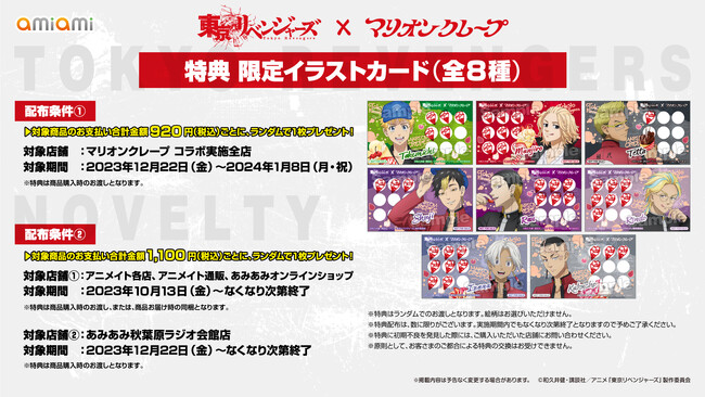 ホビー通販大手で、商品企画制作も行う「あみあみ」(大網株式会社、東京都文京区)は、TVアニメ『東京リベンジャーズ』と、人気クレープショップ『マリオンクレープ』とのコラボレーション企画「魔哩音玖麗布(マリオンクレープ)抗争 天竺編」を、2023年12月22日(金)〜2024年1月8日(月・祝)にかけて開催いたします。