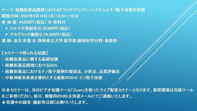 先端技術情報や市場情報を提供している(株)シーエムシー・リサーチ(千代田区神田錦町: https://cmcre.com/ )では、 各種材料・化学品などの市場動向・技術動向のセミナーや書籍発行を行っておりますが、 このたび「核酸医薬品開発におけるドラッグデリバリーシステムとナノ粒子技術の役割」と題するセミナーを、 講師に金沢 貴憲 氏 静岡県立大学 薬学部 創剤科学分野・准教授)をお迎えし、2022年4月14日(木)13:30より、 ZOOMを利用したライブ配信で開催いたします。 受講料は、 一般:44,000円(税込)、 弊社メルマガ会員:39,600円(税込)、 アカデミック価格は26,400円(税込)となっております(資料付)。